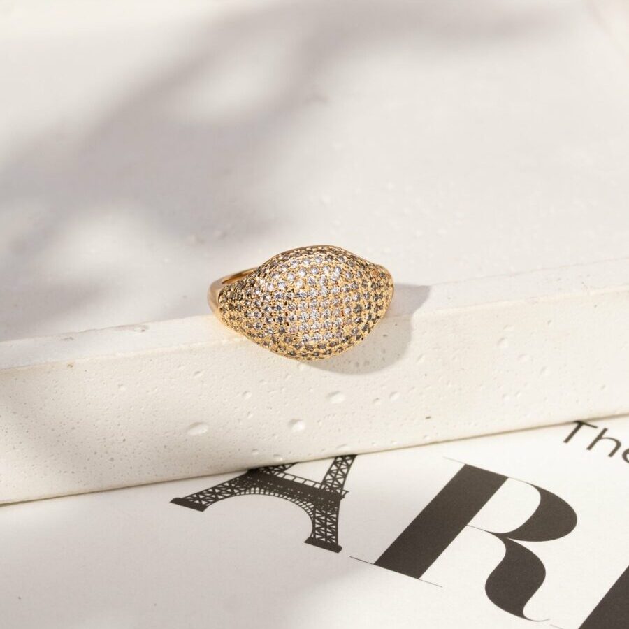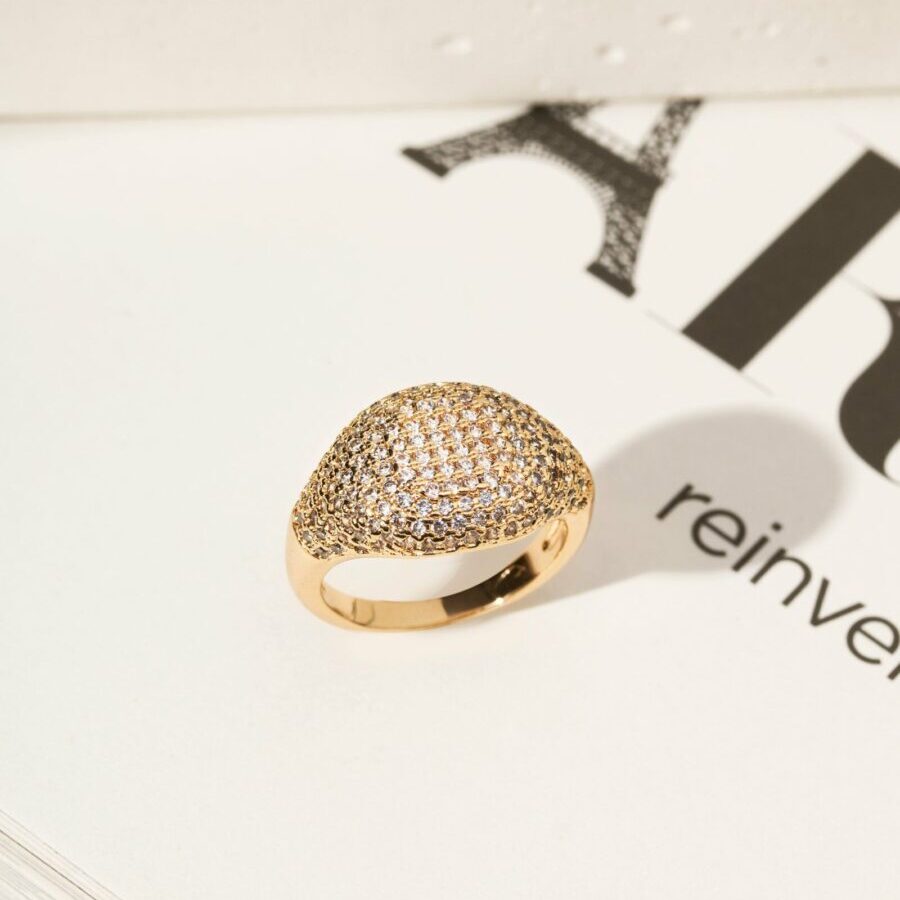 Anel retangular cravejado com zircônias brancas em banho de ouro 18k.