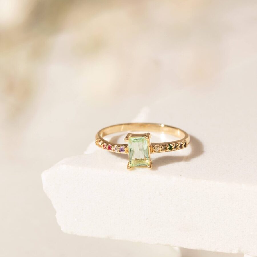 Anel retângulo cristal ametista verde em banho ouro 18k