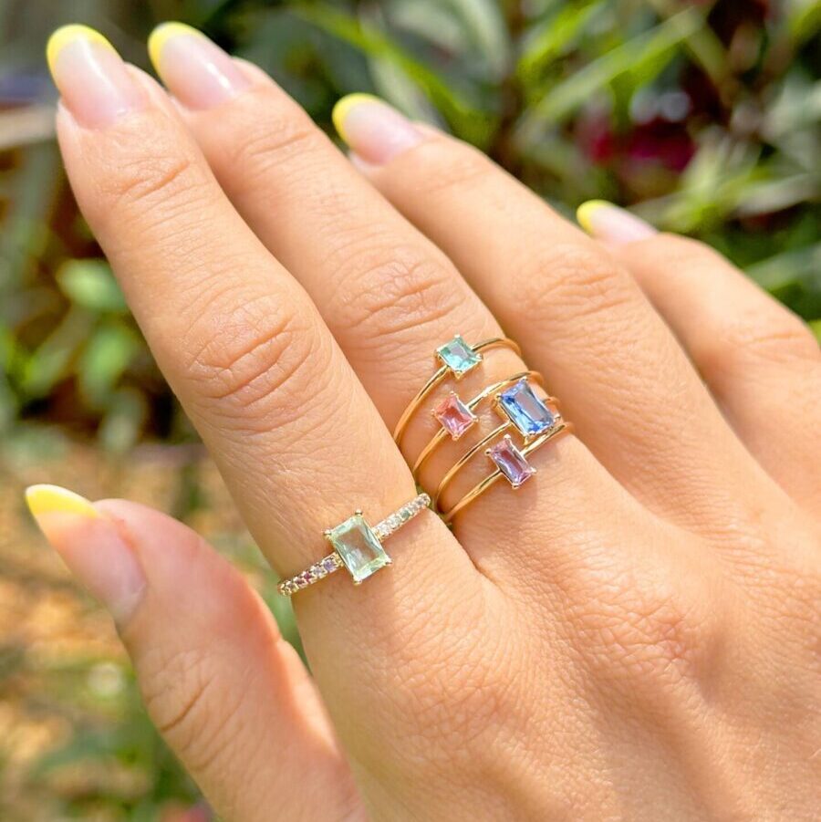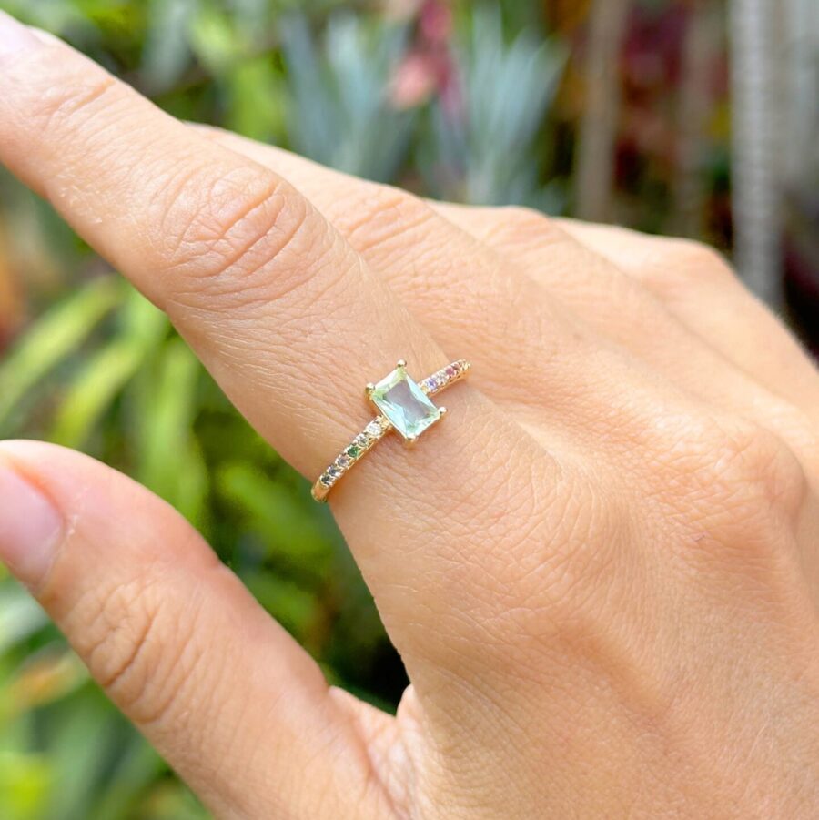Anel retângulo cristal ametista verde em banho ouro 18k.