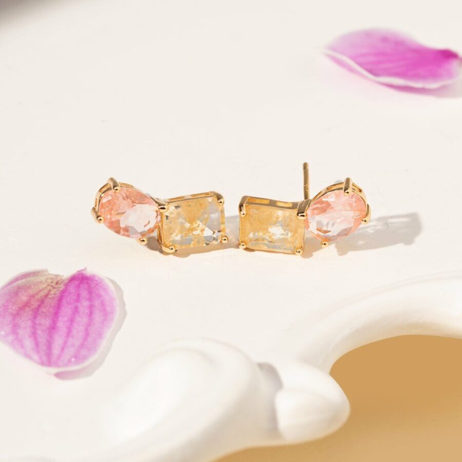 Brinco Earcuff Oval e Retângulo com Cristal Quartzo Rosa e Cristal Rutilado Banho de Ouro 18k.