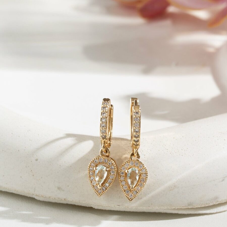 Brinco Gotinha com Cristal Topázio Azul e Zircônias Brancas Banho de Ouro 18k.