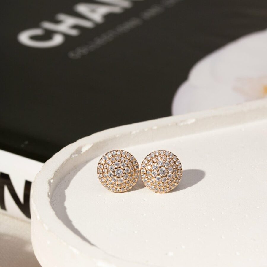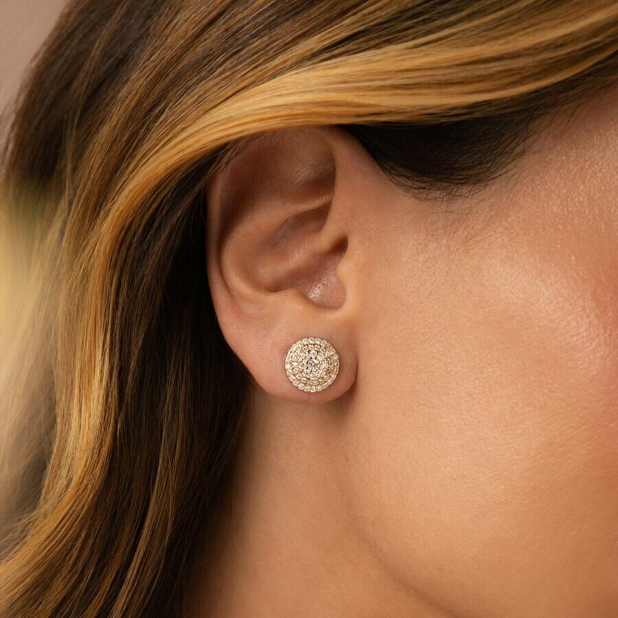 Conjunto redondo cravejado com zircônias brancas em banho ouro 18k.