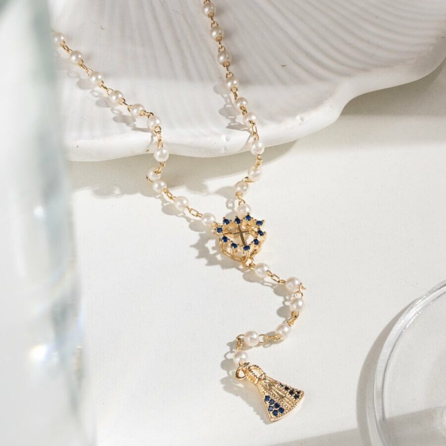 Colar Terço Nossa Senhora Aparecida e Coração com Zircônias Azuis e Pérolas Coreanas Banho de Ouro 18k.