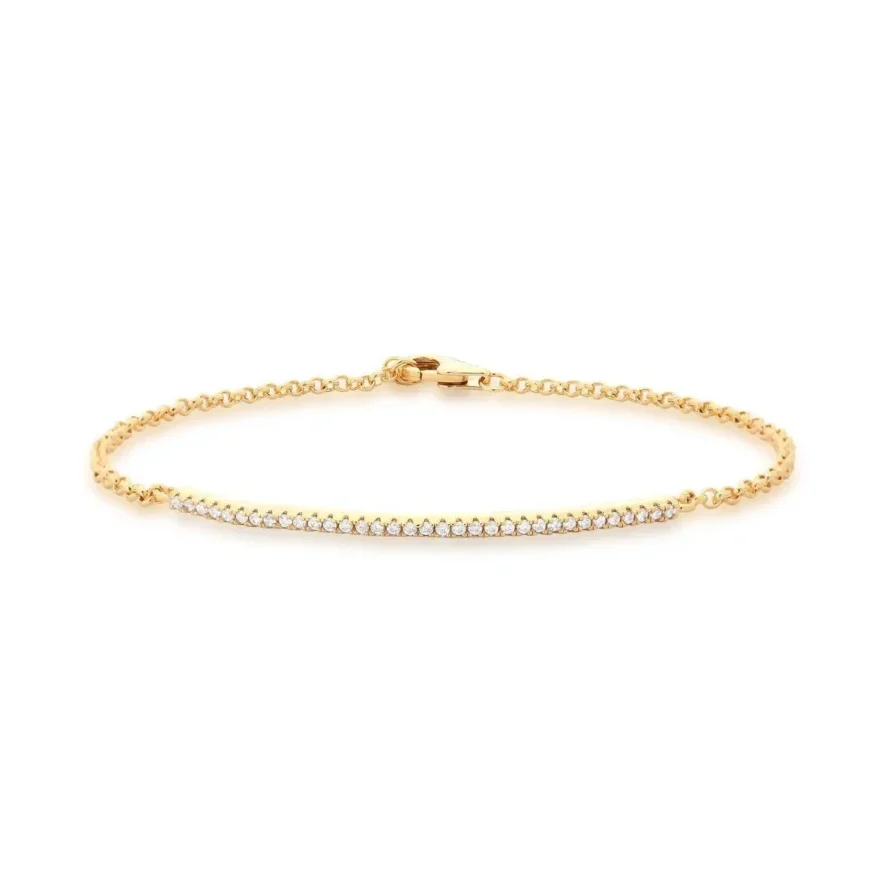 Pulseira com fileira curva cravejada com zircônias banho ouro 18k.